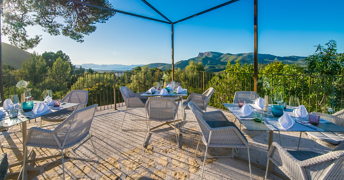 In der Bar Oro gibt es zu Drinks neuerdings auch spanische „Bocados“ – kleine Köstlichkeiten. Nicht nur bei Sonnenuntergang genießt man hier den einmaligen Panorama-Blick über die mallorquinische Landschaft mit einem Cocktail an der Outdoor-Bar oder vom eleganten Carrossa-Wintergarten aus.
