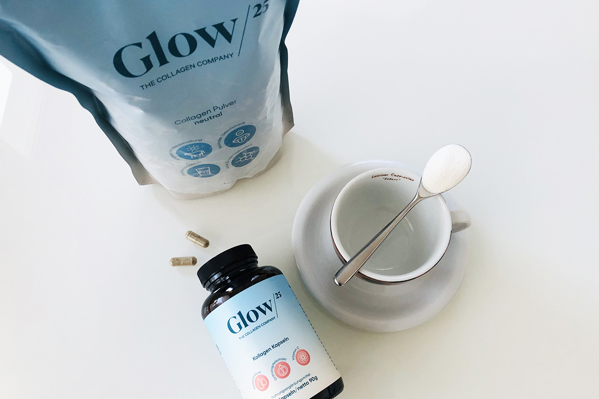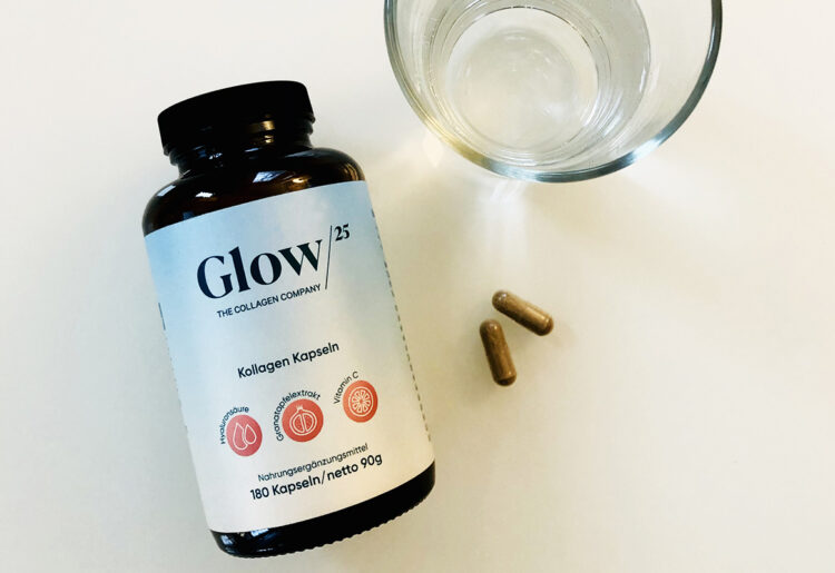 Glow25 ist ein neues Performance-Food-Label für Kollagenprodukte „Made in Germany“. Zur Wahl stehen aktuell Pulver und Kapseln. Das feine helle Pulver im Zipper-Beutel lässt sich in Kaffee oder Smoothies rühren – ein bis zwei Esslöffel genügen. Es wird ohne Zuckerzusatz hergestellt und schmeckt eher neutral. Wer Kapseln bevorzugt, nimmt davon zwei bis sechs täglich mit viel Flüssigkeit ein. Beide Produkte wurden als Kur für Haut, Haare, Nägel, Knochen und Gelenke entwickelt. Der Mix aus Kollagen-Peptiden, Hyaluronsäure, Granatapfel-Extrakt und Vitamin C wirkt hydratisierend auf Haut, Haare und Nägel und sorgt dafür, dass bereits nach zwei Wochen eine Verbesserung der Elastizität und Spannkraft sichtbar wird.