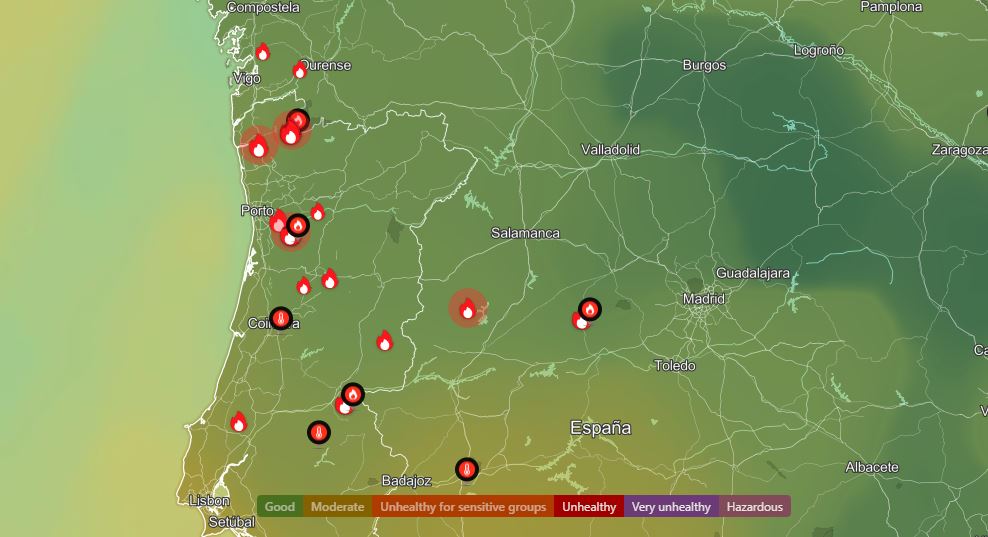 Die aktuelle Karte von IQAir veranschaulicht, wo bis Ende Juli 2025 die größten aktiven Waldbrände in Spanien lokalisiert sind (z. B. bei Ávila/Mombeltrán) sowie in Portugal.